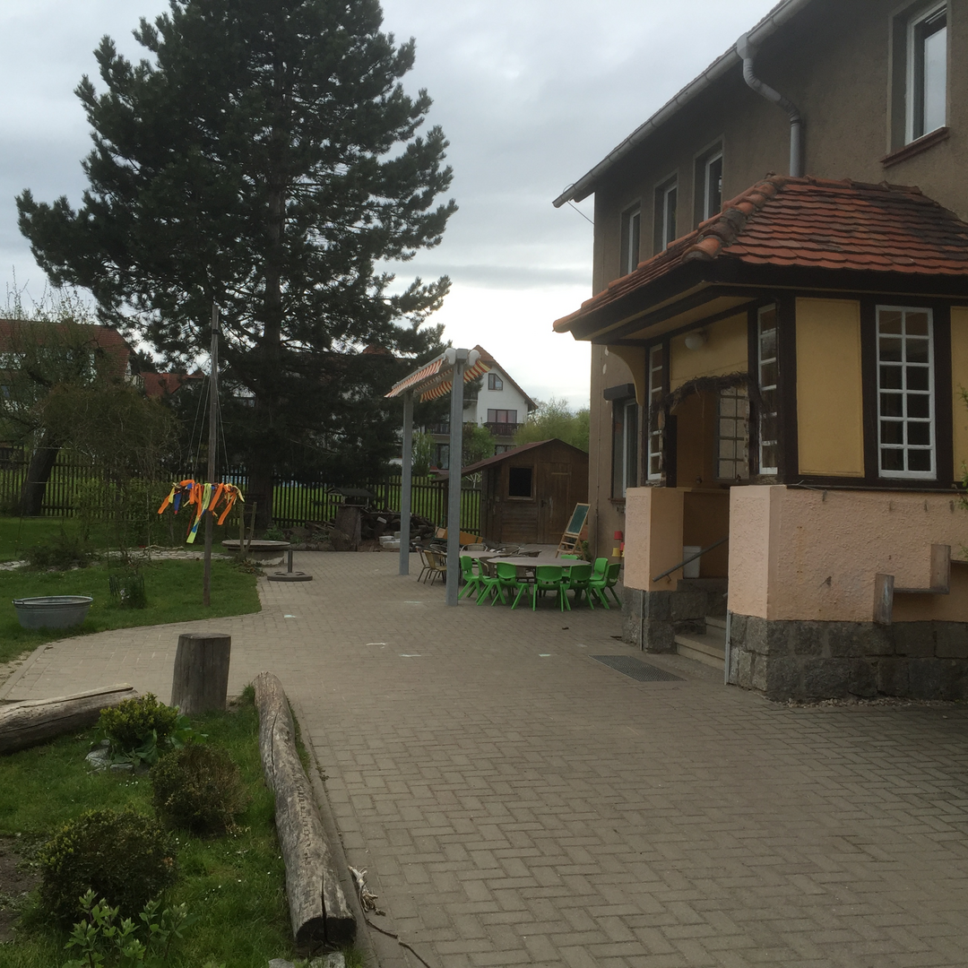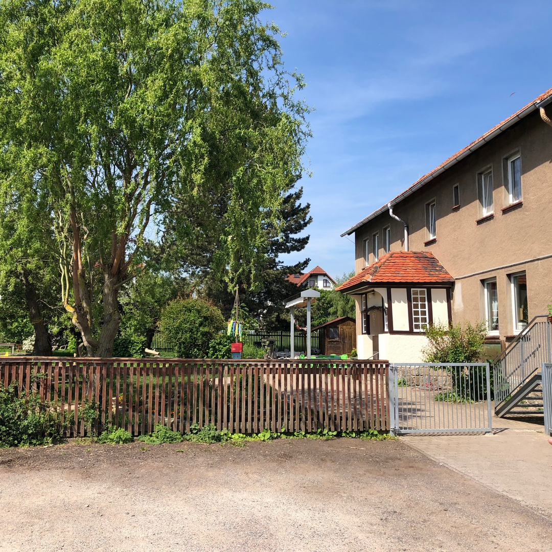 Ein naturnahes, abwechslungsreich gestaltetes Gelände mit: Sandbereich, Kletter- und Schaukelmöglichkeiten, Spielhaus, Kreativflächen wie Mal-Ecke und Matschbereiche, Obstbäume, Beerensträucher, Kräuterbeet, Fahrzeugecke und mobiles Spielmaterial